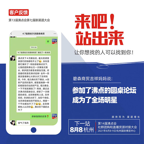 沸點天下4月展會后,最大的感受就是忙的飯都吃不上了,實在是要忙爆炸了!特別感謝沸點天下,讓我的團購事業又一次爆發式增長,很多團方都是老朋友見面,但是最初就是在沸點結緣!去年一款朋派蛋卷酥讓大家認識了吉祥媽媽,今年,借力沸點天下展會,n款新產品同時面市,都是蛋卷酥一樣的極致性價比的好產品,借力展會,一下子就就爆發了!再者,通過這次沸點的圓桌會議,感受了一次明星的感覺,走到哪都有人說,吉祥媽媽,你講的太好了,加您個微信,當天微信被加到不能加人,晚宴一個平臺都加不了了,走到哪都有人認識你,沸點天下真的太牛了。