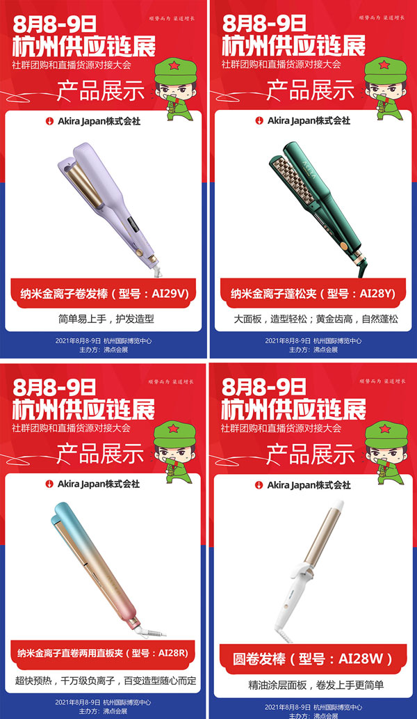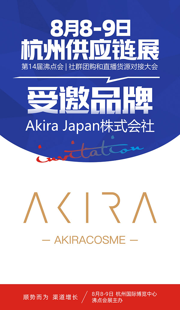 8月8杭州供應鏈展是沸點會展主辦,4458和萬團會聯合承辦,本次大會以“順勢而為,渠道增長”為主題,將聚集600+供貨商,500+平臺,500+MCN機構及個人主播,300+供應鏈前來選品洽談合作;更有20+名嘉賓與會,圍繞社群團購趨勢、爆品打造、人員裂變、活動運營、品牌塑造等多個維度進行探討交流,Akira Japan株式會社受邀參展本次展會。