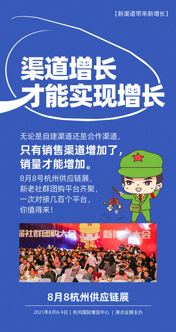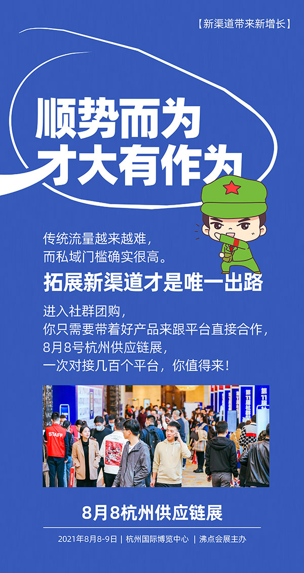 新渠道帶來新增長,8月8杭州供應鏈展,幾百個平臺現場選品,現在就預定展位,提升銷量,實現增長!