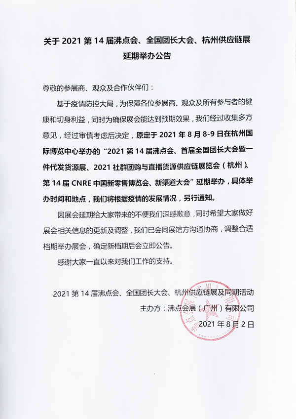 基于疫情防控大局,為保障各位參展商、觀眾及所有參與者的健康和切身利益,同時為確保展會能達到預期效果,我們經過收集多方意見,經過審慎考慮后決定,原定于2021年8月8-9日在杭州國際博覽中心舉辦的“2021第14屆沸點會、首屆全國團長大會暨一件代發貨源展、2021社群團購與直播貨源供應鏈展覽會(杭州)、第14屆CNRE中國新零售博覽會、新渠道大會”延期舉辦,具體舉辦時間和地點,我們將根據疫情的發展情況,另行通知。
