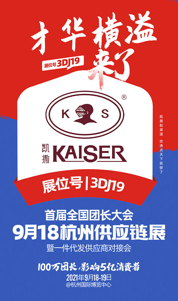 2021年9月18日,由沸點天下發起,沸點會展主辦的第14屆沸點會暨社群團購與直播選品會在杭州國際博覽中心舉辦!同期舉辦首屆全國團購團長大會一件代發貨源供應鏈對接會,來自全國的社群團購平臺、快團團、群接龍明星團長受邀參加!中國高級服裝品牌——桐鄉市才華橫溢有限公司品牌凱撒(KAISER)受邀即將參加此次展會!