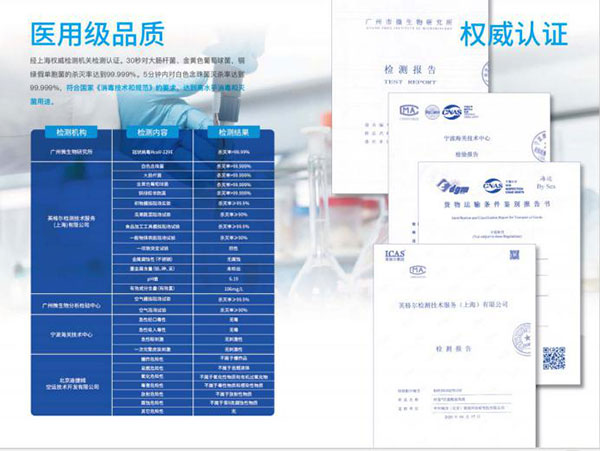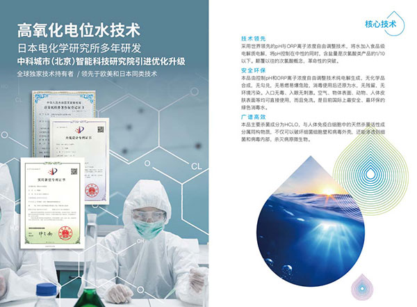 高氧化電位水利用純電解方式生成,是目前世界最穩定、最領先的電解分離技術。在中國境內取得了全套產品消毒檢測認證并正式備案成為中國正規消毒產品。經上海權威檢測機關檢測認證,高氧化電位水對大腸桿菌,金黃色葡萄球菌,銅綠假單胞菌,白色念珠菌殺滅率達到99.999%以上,符合國家《消毒技術和規范》的要求,達到高水平消毒和滅菌用途。