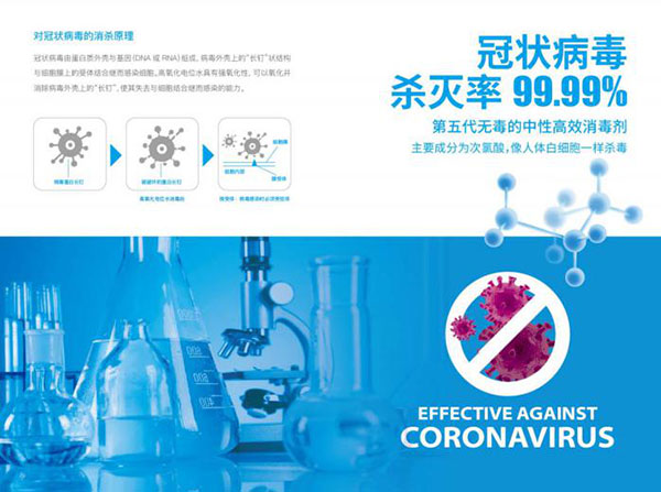 2020年針對突發其來的冠狀病毒疫情,將高氧化電位水送檢到廣州權威檢測機構檢驗結果:高氧化電位水可作為空氣專用消毒使用。高氧化電位水對粘膜無刺激,可入眼,可經口的同時,對冠狀病毒殺滅率高達99.99%以上。在空氣中噴灑,硬質物體表面噴灑,衣物上噴灑,有效阻礙病毒的傳播。還集裝箱出口到日本在連鎖藥妝店內銷售,受到了國內外的高度認可和好評。