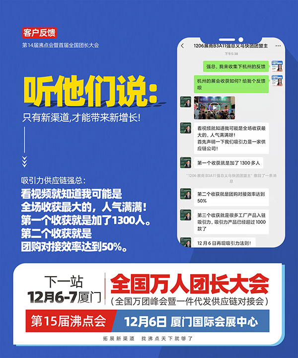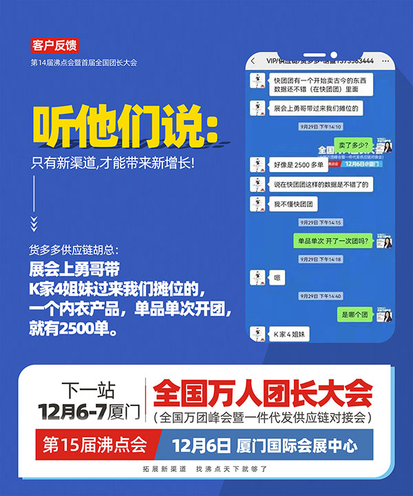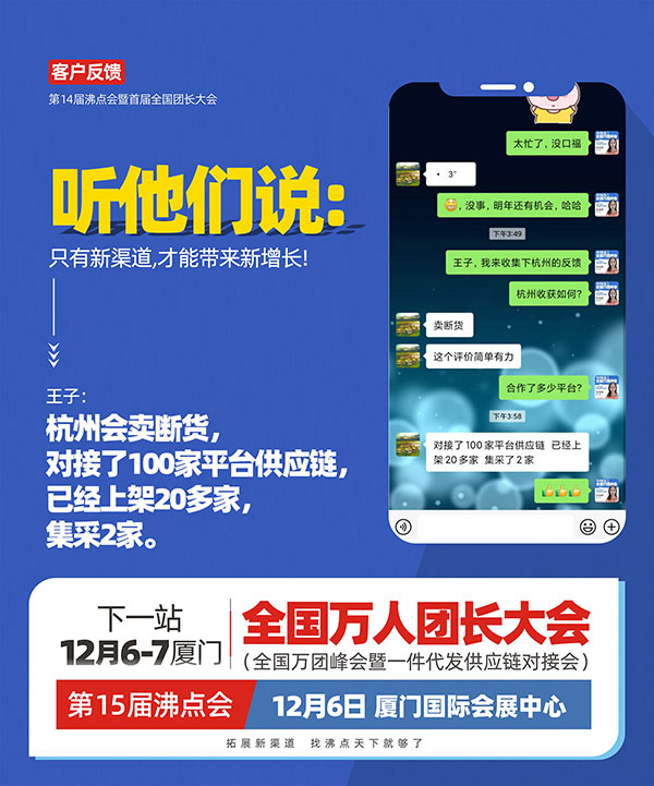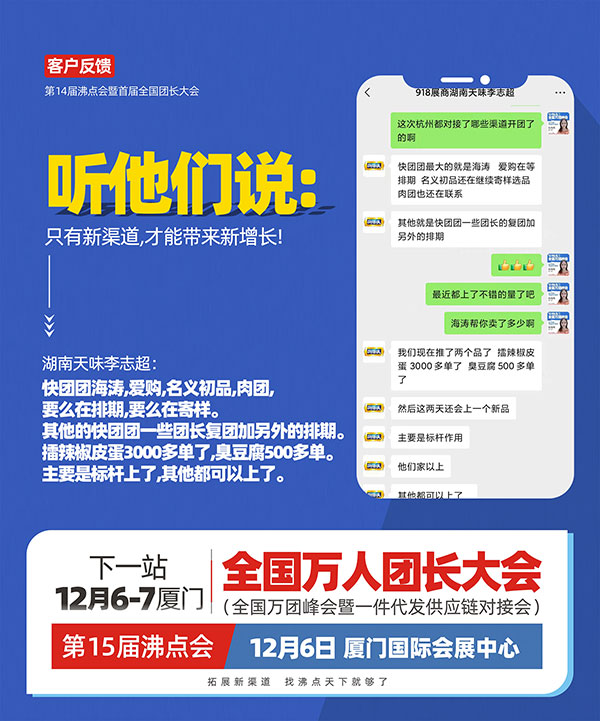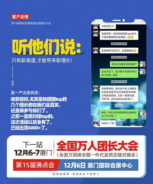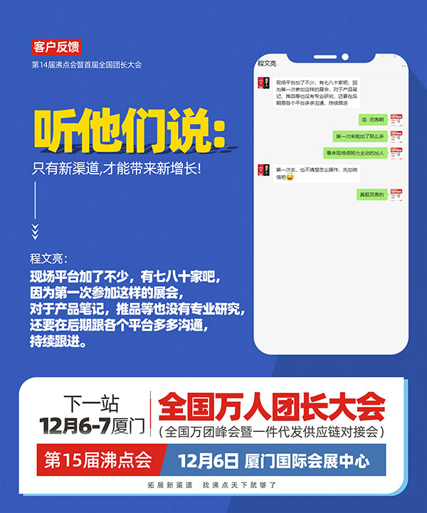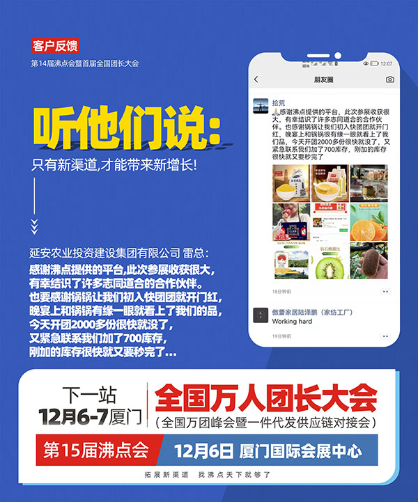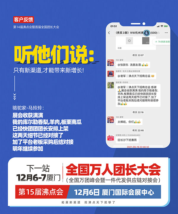首屆全國團長大會是由沸點天下創辦,沸點會展舉辦的,針對全國社群團購平臺,快團團,群接龍,有贊,微店等工具平臺團長,來選品進行資源對接的大會,于2021年9月18號在杭州舉辦,獲得了來自全國的社群團購平臺,團長,以及一件代發貨源供貨商的大力支持,2天時間共設4大對接環節,渠道方和平臺方現場對接,取得了非常好的效果,獲得了大家的一致好評。