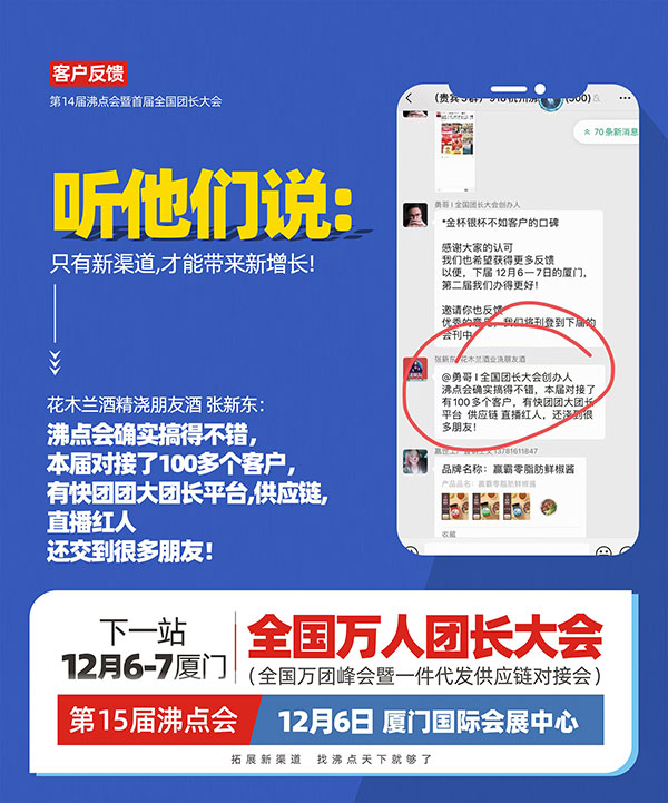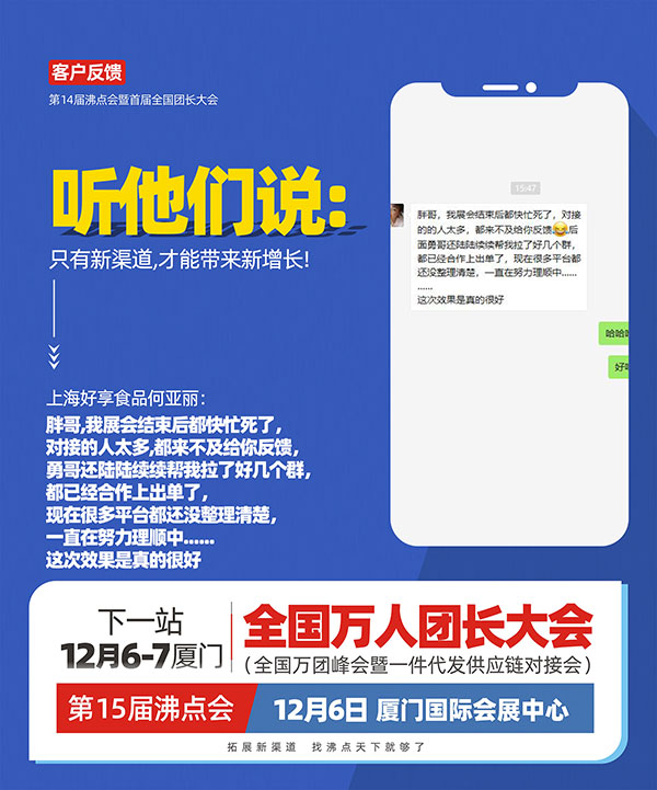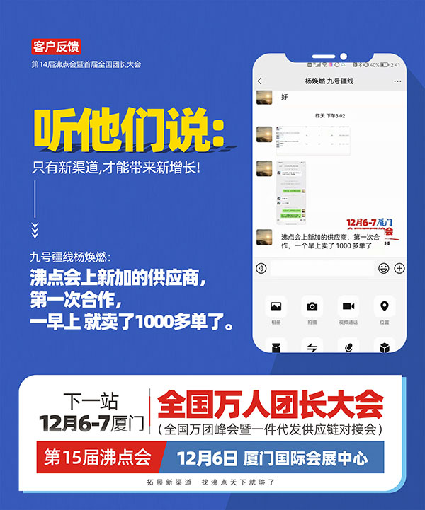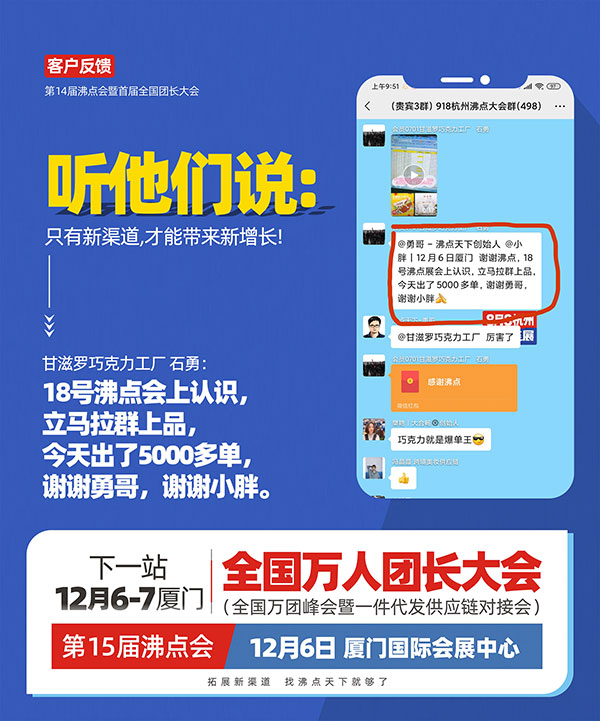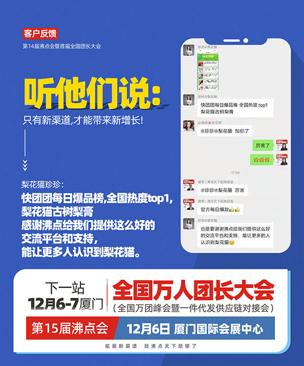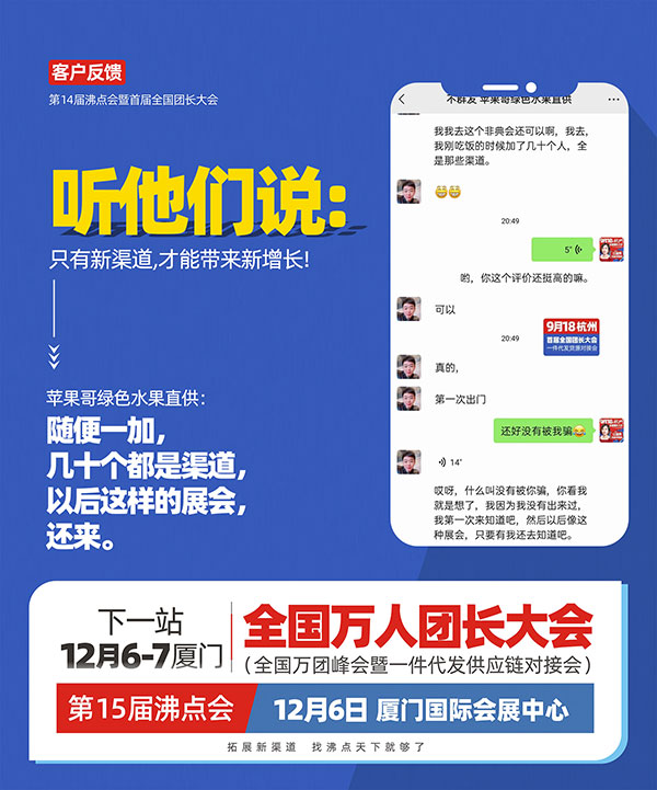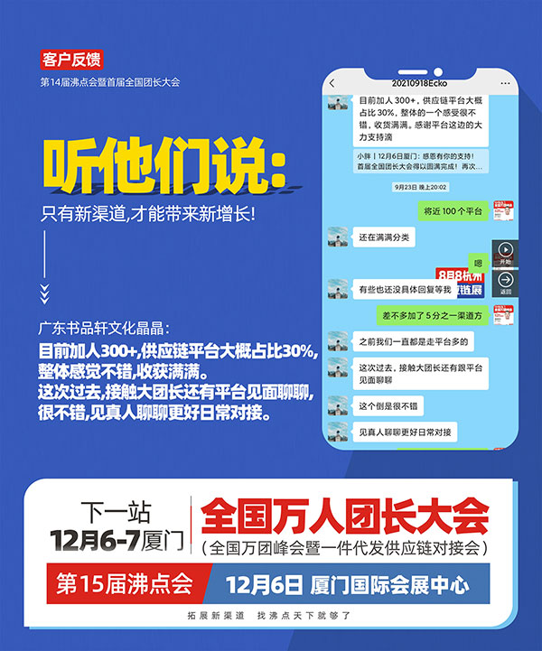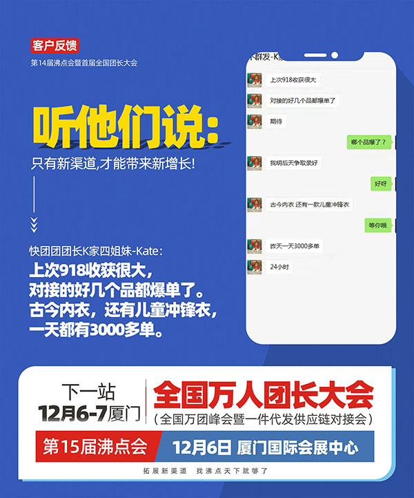 首屆全國團長大會是由沸點天下創辦,沸點會展舉辦的,針對全國社群團購平臺,快團團,群接龍,有贊,微店等工具平臺團長,來選品進行資源對接的大會,于2021年9月18號在杭州舉辦,獲得了來自全國的社群團購平臺,團長,以及一件代發貨源供貨商的大力支持,2天時間共設4大對接環節,渠道方和平臺方現場對接,取得了非常好的效果,獲得了大家的一致好評。