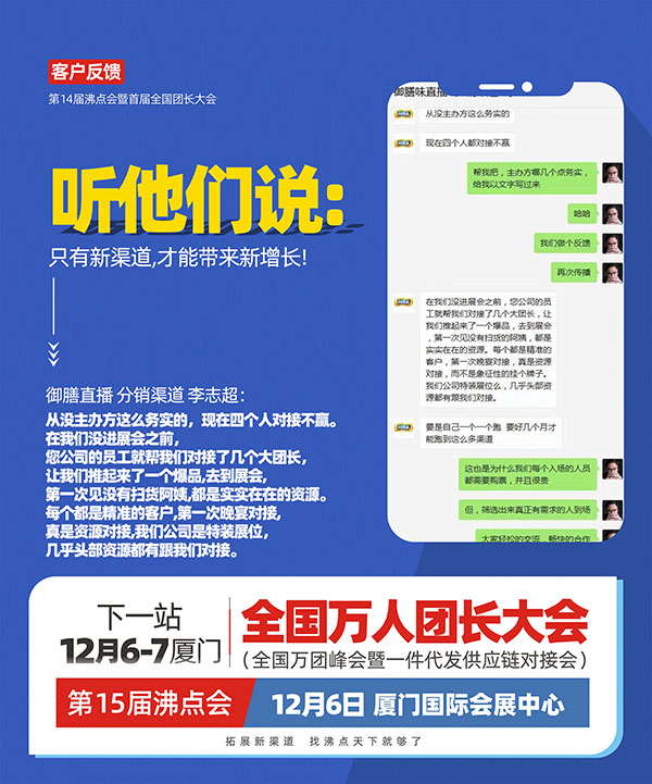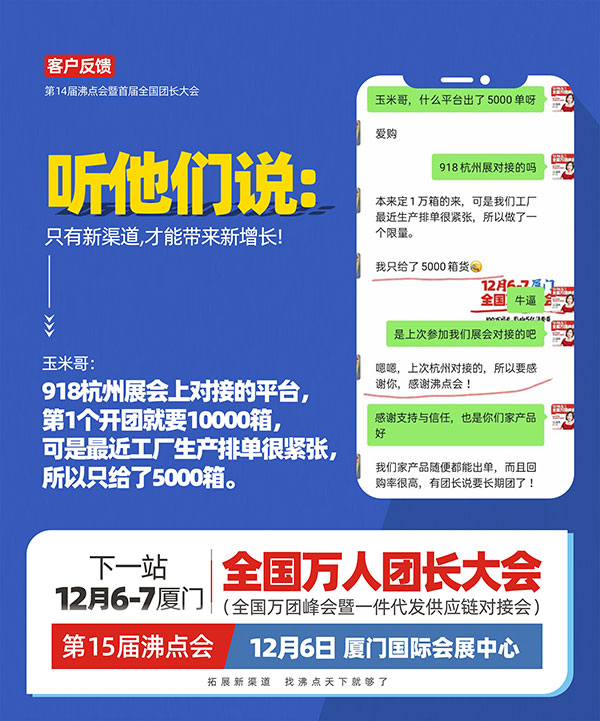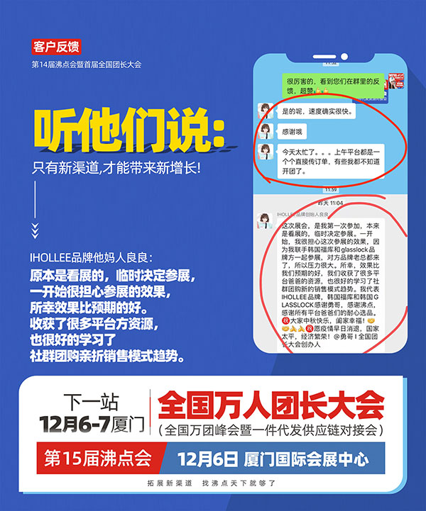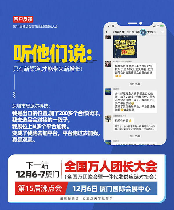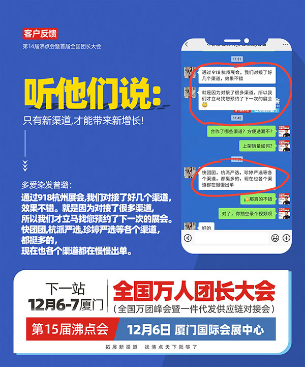 在我們沒進展會之前,您公司的員工就幫我們對接了幾個大團長,讓我們推起來了一個爆品,去到展會,第一次見沒有掃貨阿姨,都是實實在在的資源。每個都是精準的客戶,第一次晚宴對接,真是資源對接,我們公司是特裝展位,幾乎頭部資源都有跟我們對接。