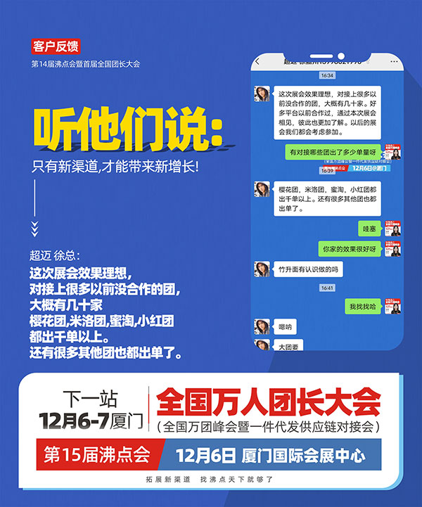 這次展會效果理想,對接上很多以前沒合作的團,大概有幾十家,櫻花團,米洛團,蜜淘,小紅團都出千單以上。還有很多其他團也都出單了。