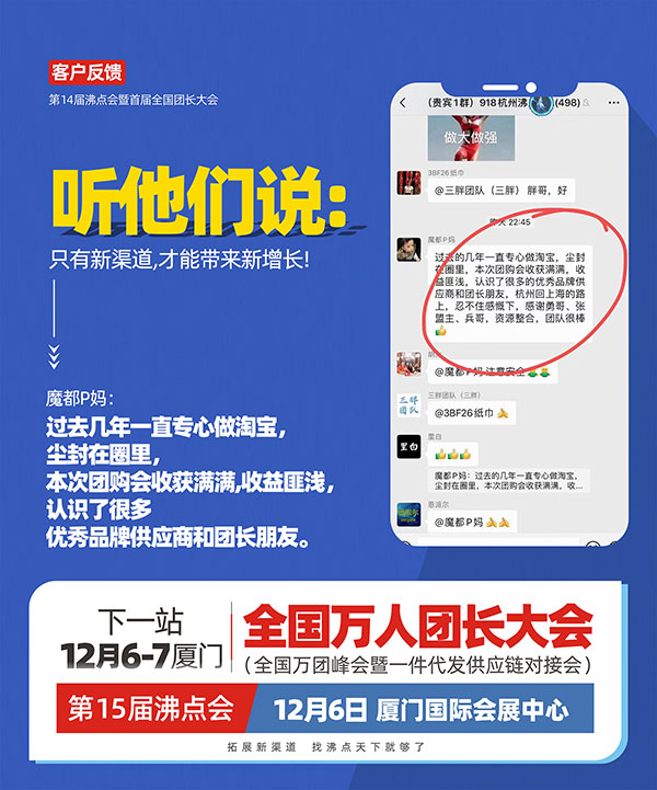 過去幾年一直專心做淘寶,塵封在圈里,本次團購會收獲滿滿,收益匪淺,認識了很多優秀品牌供應商和團長朋友。