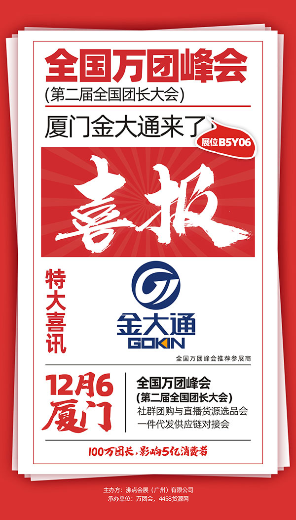 廈門全國萬人團長大會定于12月6-7日在福建廈門舉辦,團購行業(yè)的TOP100及優(yōu)秀的平臺和團長都將受邀參加并頒獎,更有母嬰、食品、零食、服飾、百貨、家居、化妝品、小家電年度TOP榜單發(fā)布。屆時,廈門金大通供應鏈有限公司將受邀參展本次活動。