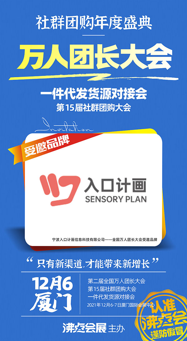第2屆全國萬人團長大會暨2021廈門供應鏈展、第15屆沸點會將于福建廈門舉辦,此次以[未來已來]100萬團長,影響5億消費者為活動主題,活動規模將達到萬人。如此盛大的展會,寧波入口計畫信息科技有限公司受邀參展!屆時歡迎您蒞臨B3X03展位參加!