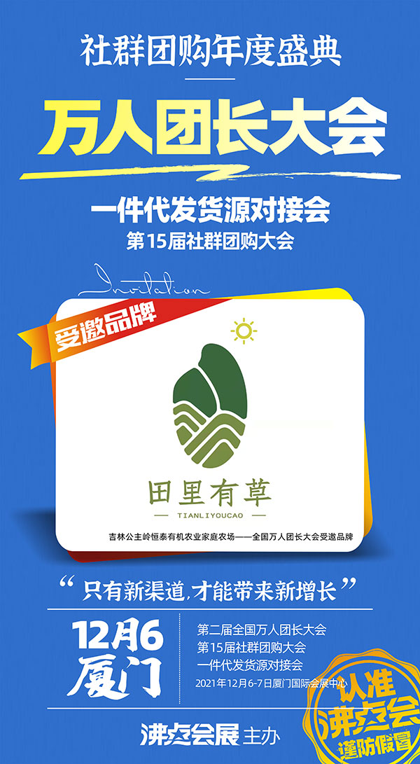 廈門全國萬人團(tuán)長(zhǎng)大會(huì)定于12月6-7日在福建廈門舉辦,團(tuán)購行業(yè)的TOP100及優(yōu)秀的平臺(tái)和團(tuán)長(zhǎng)都將受邀參加并頒獎(jiǎng),更有母嬰、食品、零食、服飾、百貨、家居、化妝品、小家電年度TOP榜單發(fā)布。屆時(shí),吉林公主嶺恒泰有機(jī)農(nóng)業(yè)家庭農(nóng)場(chǎng)旗下品牌田里有草將受邀參展本次活動(dòng)。