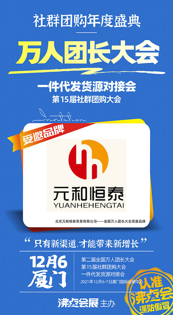 第2屆全國萬人團長大會暨2021廈門供應鏈展定于:12月6-7日在福建廈門舉辦,此次活動團購行業的TOP100及優秀的平臺和團長都將受邀參加并頒獎,更有母嬰、食品、零食、服飾、百貨、家居、化妝品、小家電年度TOP榜單發布,規模將達到萬人。屆時,北京元和恒泰貿易有限公司將受邀參展此次活動。