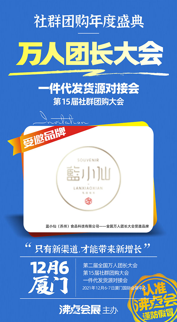 備受廣大關(guān)注的廈門全國萬人團(tuán)長大會已定于2021年12月6-7日在廈門國際會展中心開幕!本屆活動(dòng)規(guī)模將達(dá)到萬人,在招展開啟后,已有數(shù)百家品牌和團(tuán)隊(duì)與沸點(diǎn)天下達(dá)成合作,參展廈門全國萬人團(tuán)長!近日,藍(lán)小仙(蘇州)食品科技有限公司強(qiáng)勢參加此次活動(dòng)!