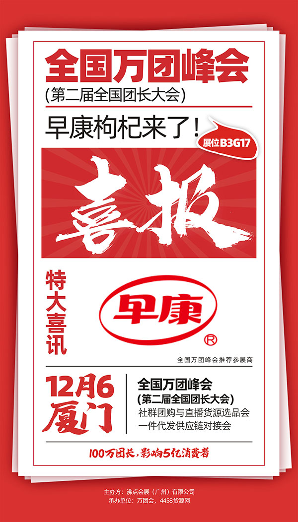 第2屆全國萬人團長大會暨2021廈門供應鏈展定于:12月6-7日在福建廈門舉辦,此次活動團購行業的TOP100及優秀的平臺和團長都將受邀參加并頒獎,更有母嬰、食品、零食、服飾、百貨、家居、化妝品、小家電年度TOP榜單發布,規模將達到萬人。屆時,早康枸杞股份有限公司將受邀參展此次活動。