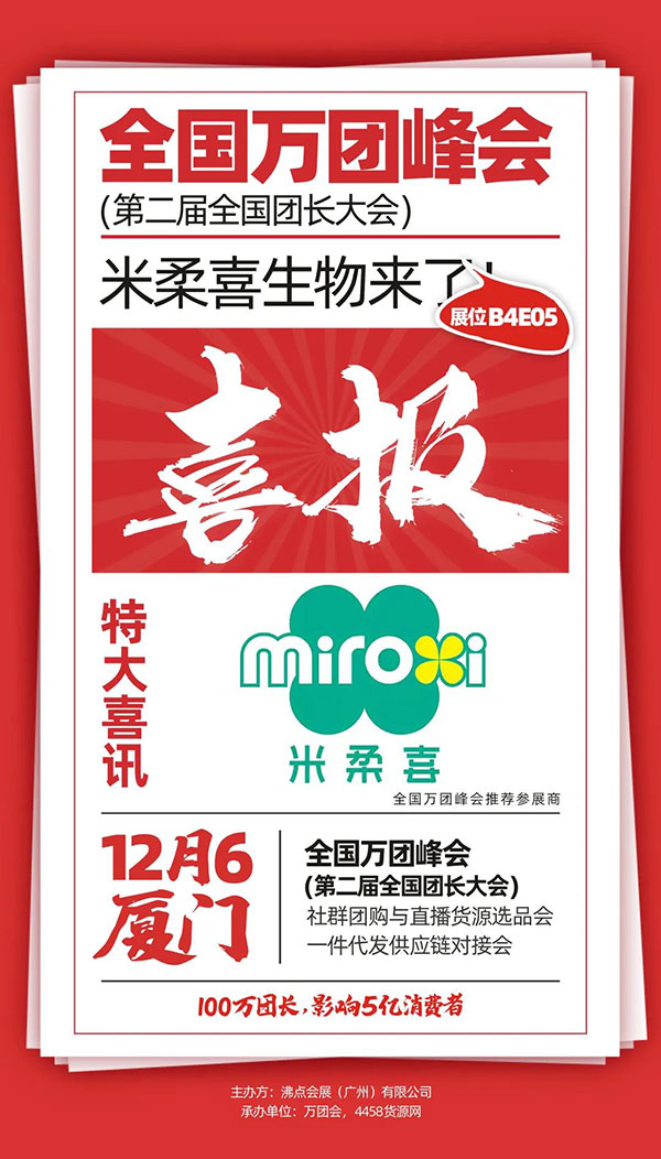 這是米柔喜第一次參加沸點活動,主要是爆品的新品發布,以及讓更多優秀的團長可以了解我們,建立好的合作機會,共謀發展,米柔喜一定盡心盡力為各位團長提供優質的產品及相關服務售后工作。12月6—7日,米柔喜品牌與您相約廈門國際會展中心!鎖定展位號:B4E05,期待你的到來!