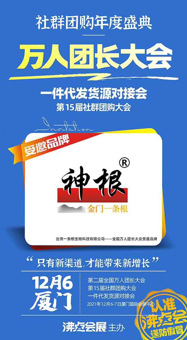 12月6號,第2屆全國萬人團長大會將于廈門舉辦,本次活動由沸點天下創辦,由沸點會展主辦,社群團購平臺,各大工具平臺頭部團長聚集,展位面積20000平,展商數量500+,新品爆品10000+,渠道方1000+,行業觀眾10000+,是社群渠道的年度盛典。屆時,臺灣一條根生物科技有限公司受邀參展,屆時歡迎您蒞臨B3X01展位參加!