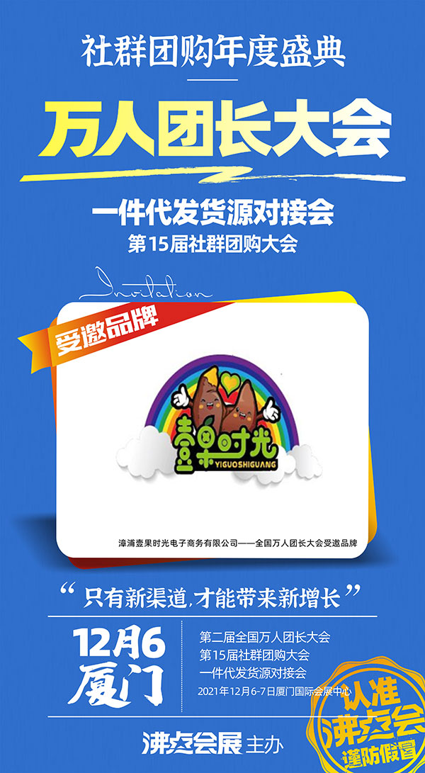 12月6號,第15屆新零售博覽會暨第2屆全國萬人團長大會,規格高、規模大、資訊新、通路全的專業特色,聚集了全國頭部團購主體,包括社群團購平臺的團長和群的群主聚集,是社群渠道的年度盛典。如此盛典,漳浦壹果時光電子商務有限公司受邀參展,屆時歡迎您蒞臨B4H08展位參加!