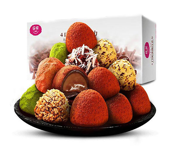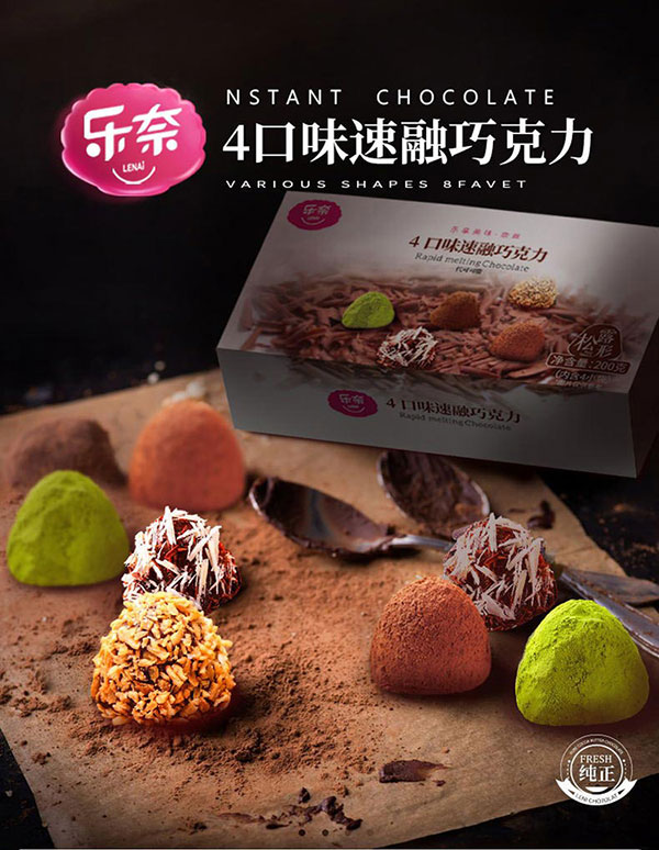 樂奈旗下產品有曲奇西餅、臺式牛軋糖、精品巧克力、爆漿麻薯、網紅雪花酥等。其中速溶巧克力,外形酷似剛出土包裹著泥土的松露,不起眼的外表下隱藏著讓人無法抗拒的美味口感。表面有一層可可粉,所以入口先苦后甜。再加上選取天然原料,口感細膩香醇、絲絲濃滑,帶給你一場味覺的盛宴。